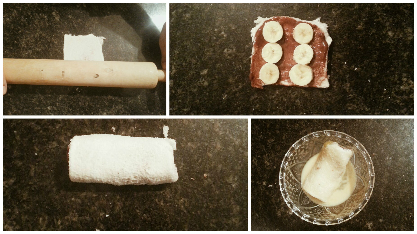 Cortar las orillas del pan rebanado (si las tiene) y aplanar con un rodillo, luego colocar el chocolate por todo el pan y agregar la banana en trozos, una vez hecho esto se debe enrollar el pan y pasarlo por huevo. Luego se debe llevar a un sartén con mantequilla y hasta que quede dorado. Una vez listo podemos colocarle chocolate o azúcar con canela en la parte superior.